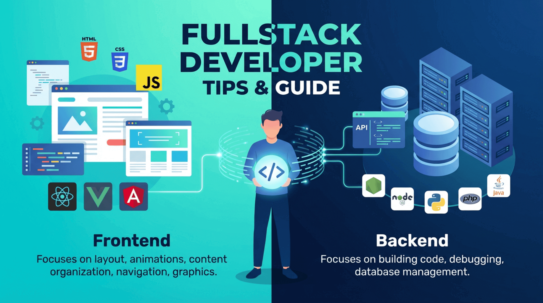 Backend ke liye aapko Node.js, Python (Django/Flask), PHP (Laravel), Ruby on Rails ya Java (Spring) me se ek ya multiple seekhna zaruri hai. Frontend ke liye React, Angular, Vue.js ya Svelte jaise modern frameworks me proficiency aapko competitive banati hai. JavaScript aur TypeScript dono ki knowledge essential hai kyunki frontend aur backend me dono me use hoti hai.